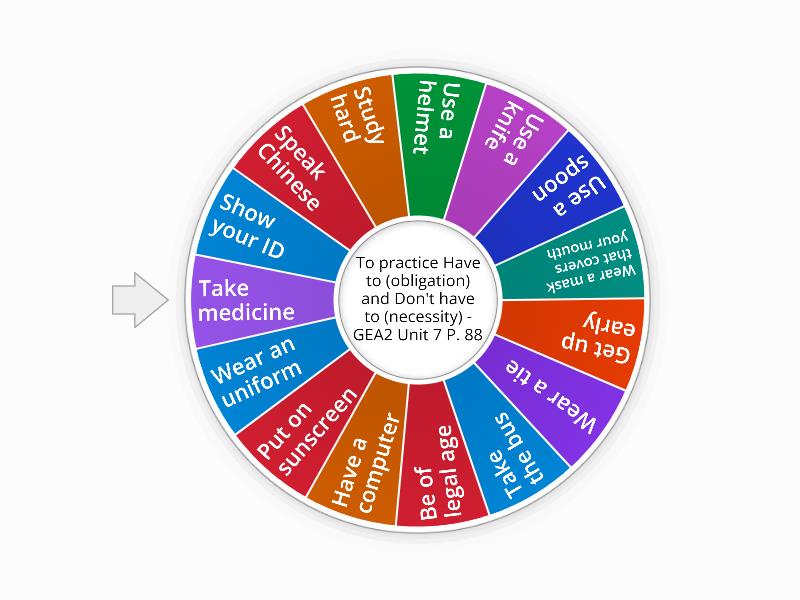 1) Show your ID 2) Speak Chinese 3) Study hard 4) Use a helmet 5) Use a knife 6) Use a spoon 7) Wear a mask that covers your mouth 8) Get up early 9) Wear a tie 10) Take the bus 11) Be of legal age 12) Have a computer 13) Put on sunscreen 14) Wear an uniform 15) Take medicine