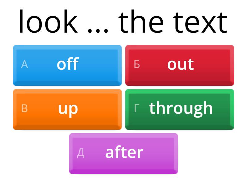 1) look ... the text a) off b) out c) up d) through e) after 2) The window looks ... onto the market. a) off b) out c) up d) through e) after 3) find ... information a) off b) out c) up d) through e) after 4) tackle ... problems a) with b) to c) - d) about e) for 5) deal ... problems a) with b) to c) - d) about e) for 6) face ... problems a) with b) to c) - d) about e) for 7) look forward ... the celebration a) with b) to c) in d) about e) for 8) apologise ... my friend ... the mistake a) with, for b) with, about c) for, to d) to, about e) to, for 9) tend ... buy a) for b) with c) to d) about e) in 10) congratulate ... birthday a) for b) with c) to d) about e) on 11) keep people up ... date a) for b) with c) to d) about e) on 12) give ... smoking = stop a) for b) down c) away d) up e) off 13) put ... a meeting = postpone a) away b) out c) up d) down e) off 14) keep ... = continue a) away b) out c) up d) on e) off 15) thanks ... the Internet a) for b) with c) to d) on e) about 16) thank people ... the congratulation a) for b) with c) to d) on e) about 17) put ... with the noise a) for b) with c) to d) on e) up 18) think ... a future career a) of b) with c) to d) on e) up 19) got used ... have a) of b) with c) to d) on e) up 20) prevent species ... dying a) of b) about c) off d) on e) from 21) object ... the coming a) of b) about c) off d) on e) to 22) have a genius ... working alone a) by b) about c) with d) for e) to 23) be exposed ... economic downturn a) by b) about c) with d) for e) to 24) indulge ... games a) in b) about c) with d) for e) to 25) pick children ... to school = give a lift a) off b) away c) up d) for e) to 26) focus ... details a) about b) on c) in d) for e) to 27) forgive me ... being rude a) about b) on c) in d) for e) to 28) approve ... excellence a) about b) on c) of d) for e) to