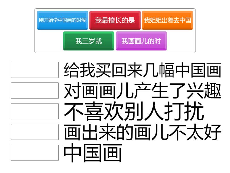 我三岁就 - 中国画, 我画画儿的时 - 不喜欢别人打扰, 我最擅长的是 - 画出来的画儿不太好, 我姐姐出差去中国 - 给我买回来几幅中国画, 刚开始学中国画的时候 - 对画画儿产生了兴趣,