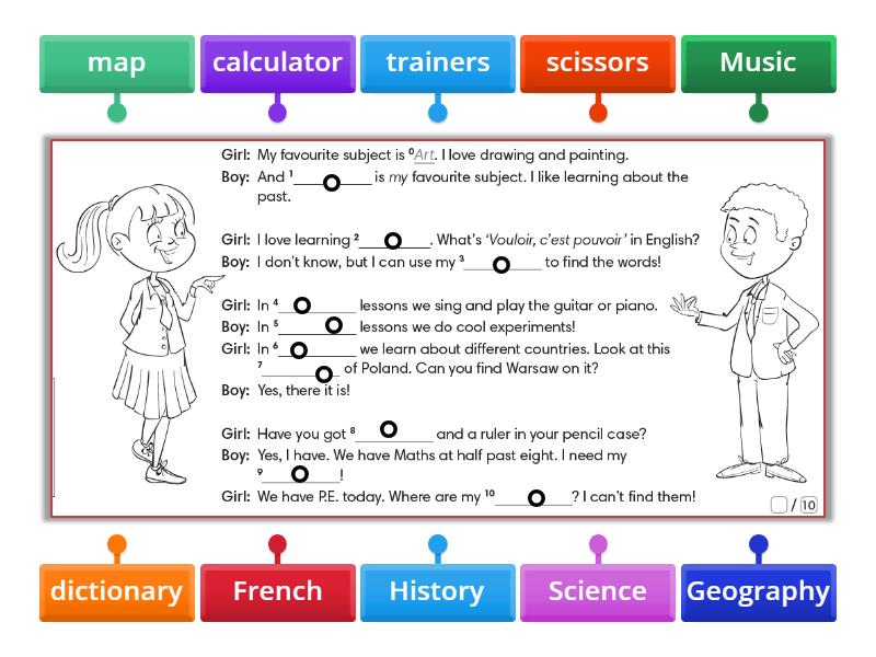 History, French, dictionary, Music, Science, Geography, map, scissors, calculator, trainers.