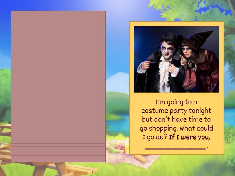 My friend’s extremely rich family doesn’t accept me. Help! If I were you, __________, I’m going to a costume party tonight but don’t have time to go shopping. What could I go as? If I were you, ________________ ., My boss still pronounces my name incorrectly. Shall I say anything? If I were you, ______________ ., My workmates have invited me on a boat trip, but I get sea sick. If I were you, ___________________ ., I’ve noticed my colleague is taking pens from the office home. Shall I say anything? If I were you, _________________ ., I’ve been invited to dinner by my friend’s parents. What shall I take? If I were you, ______________ ., I’ve got a very sore throat. If I were you, ______________ ., I think I waste too much time on the internet. If I were you, ______________..