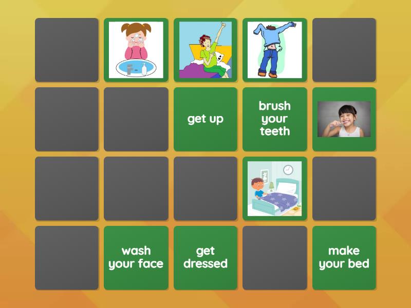 get up, brush your teeth, wash your face, get dressed, make your bed, go to school, go home, take a shower, pack your backpack, go to bed,