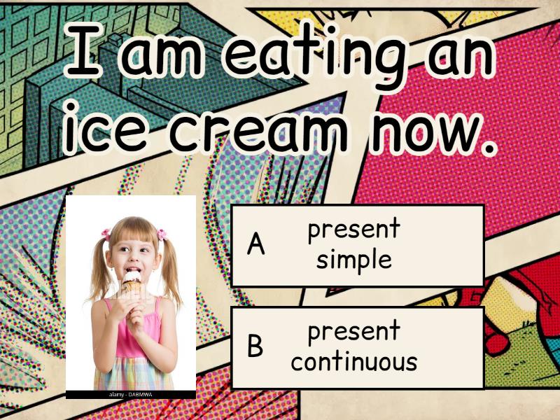1) I am eating an ice cream now. a) present simple b) present continuous 2) I have lunch in the afternoon. a) present simple b) present continuous 3) Grace has English lessons in the afternoon. a) present simple b) present continous 4) We are speaking English at the moment. a) present simple b) present continuous 5) I brush my teeth every day. a) present simple b) present continous 6) You are looking at the teacher now. a) present simple b) present continuous 7) I have dinner at night. a) present simple b) present continuous 8) He is crying at the moment. a) present simple b) present continous