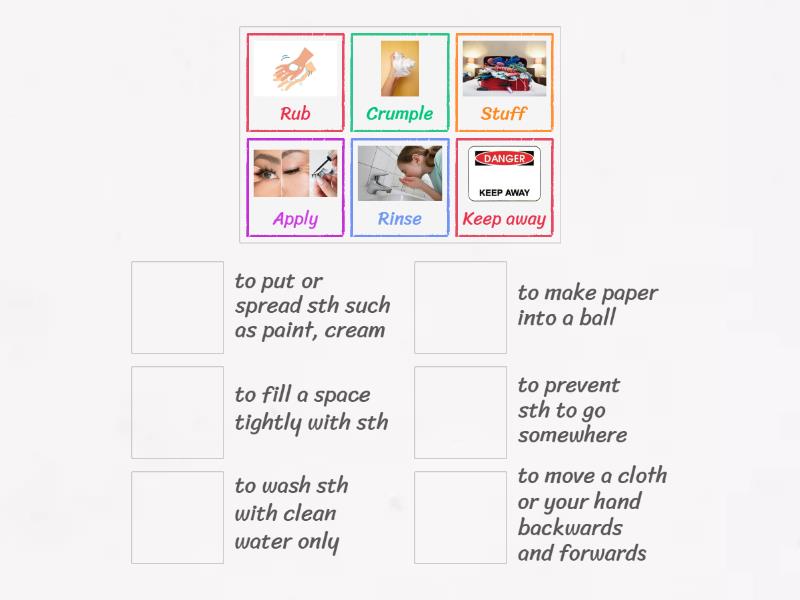 Rinse - to wash sth with clean water only, Rub - to move a cloth or your hand backwards and forwards, Apply - to put or spread sth such as paint, cream, Keep away - to prevent sth to go somewhere, Stuff - to fill a space tightly with sth, Crumple - to make paper into a ball,