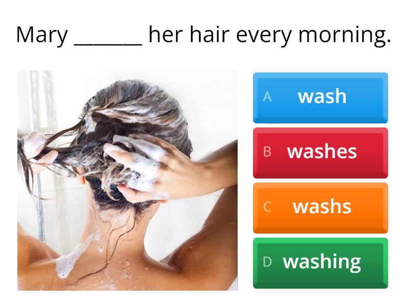 1) She ..... at the office. a) doesn't work b) work c) don't work d) works 2) My father ..... ....... cigarettes. (NOT) a) smokes b) smoke c) doesn't smoke d) don't smoke 3) I .... .... meat. (NOT) a) doesn't eat b) don't eat c) eat d) does eat 4) We ..... to the radio. a) live b) listen c) drink d) listens 5) Alice and Mark .... ..... in London. (NOT) a) isn't living b) doesn't live c) don't live d) lives 6) You ..... to the cinema at weekends. a) go b) play c) goes d) plays 7) A teacher ________ in a school.  a) doesn't work b) work c) don't work d) works 8) A waiter _________ in a school.  a) works b) work c) doesn't work d) don't work 9) Mary _______ her hair every morning. a) wash b) washes c) washs d) washing 10) Lewis and Ann _______ to the cinema on Fridays. (+ve) a) goes b) doesn't go c) go d) don't go 11) Janet ________ her homework after class. (NOT) a) doesn't b) don't do c) doesn't do d) don't 12) My parents ______ tea every morning. (+ve) a) drink b) drinks c) don't drink d) doesn't drink