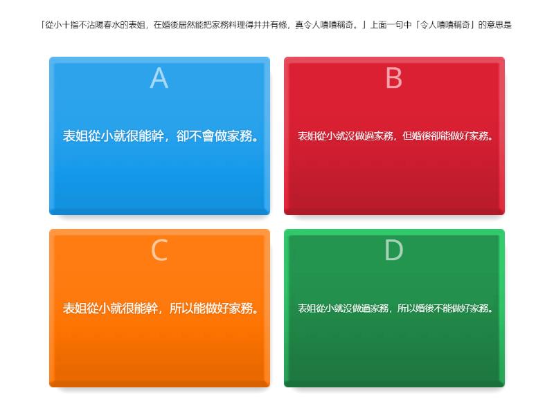 1) 「從小十指不沾陽春水的表姐,在婚後居然能把家務料理得井井有條,真令人嘖嘖稱奇。」上面一句中「令人嘖嘖稱奇」的意思是 a) 表姐從小就很能幹,卻不會做家務。 b) 表姐從小就沒做過家務,但婚後卻能做好家務。 c) 表姐從小就很能幹,所以能做好家務。 d) 表姐從小就沒做過家務,所以婚後不能做好家務。 2) 「香港海洋公園是世界上最大的海洋公園之一,它不但有新奇刺激的水上樂園,還有展品豐富的展覽館,所以它能與迪士尼樂園一起入選『全球十大最受歡迎的主題公園』。」 a) 香港海洋公園的特色。 b) 香港海洋公園是全球最受歡迎的主題公園之一。 c) 香港海洋公園與迪士尼樂園地位相當。 d) 香港海洋公園入選「全球十大最受歡迎的主題公園」的原因。 3) 「驟雨初歇,地面上形成了一個個小水漥,那屋簷上的水滴如同斷了線的珍珠,滴滴答答地掉落在窗台上,奏出清脆悅耳的旋律。」上面一句主要寫 a) 驟雨初歇時的景象。 b) 水滴如同珍珠般晶瑩透亮。 c) 水滴在窗台上奏出旋律。 d) 驟雨過後的地面上形成小水漥。 4) 「這次辯論賽,甲隊最後竟然把乙隊辯駁得啞口無言,賽果真令人驚奇。」上面一句主要寫 a) 甲隊應該比乙隊弱,最終輸了。 b) 乙隊應該比甲隊強,最終輸了。 c) 乙隊應該比甲隊弱,最終輸了。 d) 甲隊應該比乙隊強,最終輸了。 5) 「祖母經常對我說,一個人若習慣了處於安定的環境中,忘記提醒自己不幸的事情隨時會發生,那是很危險的。」祖母希望我 a) 樂天知命 b) 隨遇而安 c) 不安本分 d) 居安思危 6) 「不少樹木葉片上的絨毛或葉片分泌出的油脂都能吸附空氣中的粉塵,降低空氣的含塵量,從而淨化空氣,因而樹木被譽為『天然除塵器』。」 a) 形態 b) 別稱 c) 構造 d) 功用 7) 「在人們眼中,不管經歷了多少風雨,這座民族英雄的銅像總是閃閃發亮。」銅像總是閃閃發亮的原因是 a) 銅像象徵着英雄的崇高精神。 b) 銅像的顏色十分亮麗。 c) 銅像的製作技術十分高超。 d) 銅像受到良好的保養。 8) 「這個老婆婆每天推着手推車在街上四處走動,專門收集別人棄置的紙皮和汽水罐,卻從不接受別人給她的錢。」上面一句主要寫甚麼? a) 社會應關注老人的生活狀況。 b) 老婆婆堅持靠自己的努力來維持生計。 c) 政府給予老婆婆的救濟十分微薄。 d) 賣紙皮和汽水罐所賺的錢比別人所給的錢多。 9) 「參加百米短跑比賽的嘉棋眨眼就衝到了終點。」上面一句的意思是 a) 嘉棋的跑步速度無人能及。 b) 嘉棋在百米短跑比賽中跑得很輕鬆。 c) 嘉棋站在終點線上,不斷地眨眼。 d) 嘉棋在很短的時間內就跑到了終點。 10) 「這個偵探故事的情節撲朔迷離,不讀到最後也猜不出哪個角色才是兇手。」猜不出哪個角色是兇手的原因是 a) 故事是虛構的。 b) 故事的情節不完整。 c) 故事中沒有提及。 d) 故事的情節錯綜複雜。 11) 「這篇文章反映了人類的黑暗面,真值得我細細咀嚼啊!」「我」對這篇文章的評價是 a) 文章的文字毫無美感。 b) 文章十分吸引讀者追看。 c) 文章值得讀者反覆品味。 d) 文章要邊吃東西邊看才有味道。 12) 「經過多番的商議和修訂後,香港的禁煙條例正式出台了。」上面一句的意思是 a) 香港將會變成無煙城市。 b) 香港已正式公佈禁煙條例。 c) 香港將會設立禁止吸煙區。 d) 香港曾多次修改禁煙條例。 13) 「這款新型的智能手機不僅外觀時尚,而且機身輕薄,售價也並不昂貴,所以廣受年輕消費者的歡迎。」上面一句主要寫 a) 新型智能手機的售價相對便宜。 b) 新型智能手機的機身重量很輕。 c) 新型智能手機的外觀十分時尚。 d) 新型智能手機廣受歡迎的原因。 14) 「哥哥是我學習的榜樣,他除了學習成績優異外,更是學校田徑隊的主力,而且還獲得了本屆校園歌手大賽的冠軍。」上面一句主要寫哥哥的表現 a) 莫衷一是 b) 鶴立雞羣 c) 始料未及 d) 差強人意 15) 「要想拍出好照片,首先要有一雙能夠發現美的眼睛,其次要學會捕捉並定格美好的瞬間,而精密的攝影器材只是令照片更有質感罷了。」上面一句主要寫 a) 拍照的具體方法。 b) 拍照者應如何捕捉美好瞬間。 c) 拍出好照片的要訣。 d) 精密的攝影器材使照片更好看。
