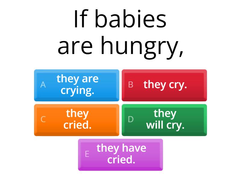 1) If babies are hungry,  a) they are crying. b) they cry. c) they cried. d) they will cry. e) they have cried. 2) If you mix hydrogen and oxygen, a) you get water. b) you got water. c) you'll get water. d) you've got water. e) you're getting water. 3) If students are late for class, a) the teacher will get angry b) the teacher's getting angry. c) the teacher gets angry. d) the teacher has got angry. e) the teacher was angry. 4) If plants don't get enough water, a) it dies. b) they'll die. c) it'll die. d) they die. e) they've died 5) If we don't drink, a) we've got thirsty. b) we're getting thirsty. c) you get thirsty. d) we get thirsty. e) you'll get thirsty.