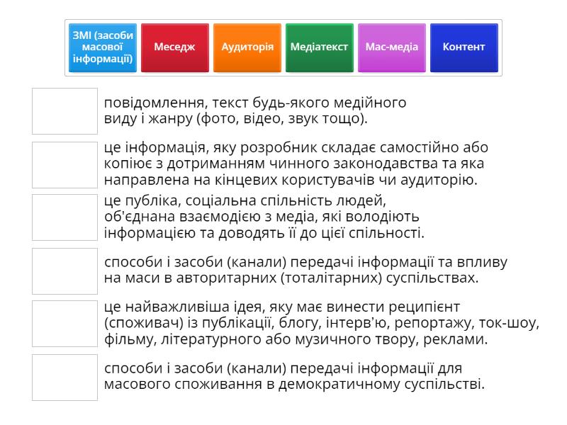 Мас-медіа - способи і засоби (канали) передачі інформації для масового споживання в демократичному суспільстві., ЗМІ (засоби масової інформації) - способи і засоби (канали) передачі інформації та впливу на маси в авторитарних (тоталітарних) суспільствах., Медіатекст - повідомлення, текст будь-якого медійного виду і жанру (фото, відео, звук тощо)., Меседж - це найважливіша ідея, яку має винести реципієнт (споживач) із публікації, блогу, інтерв’ю, репортажу, ток-шоу, фільму, літературного або музичного твору, реклами., Контент - це інформація, яку розробник складає самостійно або копіює з дотриманням чинного законодавства та яка направлена на кінцевих користувачів чи аудиторію., Аудиторія - це публіка, соціальна спільність людей, об'єднана взаємодією з медіа, які володіють інформацією та доводять її до цієї спільності.,