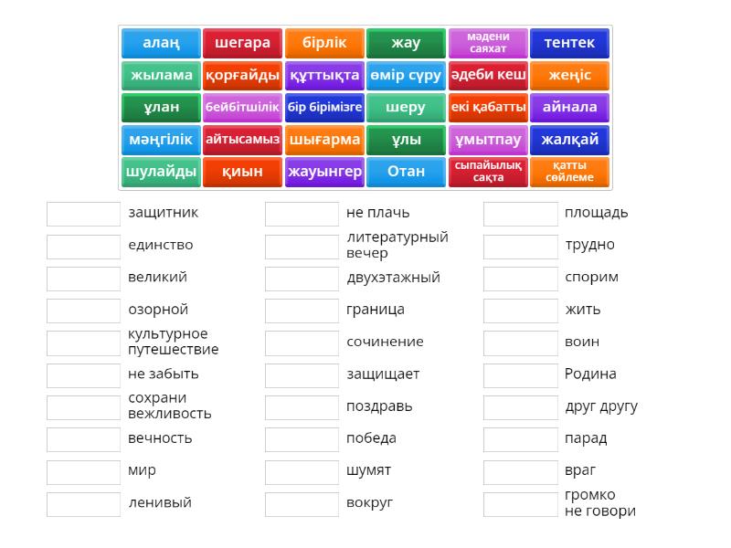 мәдени саяхат - культурное путешествие , сыпайылық сақта - сохрани вежливость , қатты сөйлеме - громко не говори, жалқай - ленивый, шулайды - шумят, қиын - трудно, тентек - озорной , әдеби кеш - литературный вечер, айтысамыз - спорим, жылама - не плачь , екі қабатты - двухэтажный, ұлы - великий, айнала - вокруг, шығарма - сочинение, құттықта - поздравь, бір бірімізге - друг другу , бірлік - единство , шеру - парад, алаң - площадь, өмір сүру - жить , Отан - Родина, шегара - граница, жеңіс - победа, жауынгер - воин, ұмытпау - не забыть, жау - враг, бейбітшілік - мир, мәңгілік - вечность , ұлан - защитник , қорғайды - защищает ,