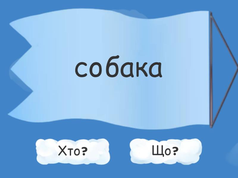 Хто?: собака, діти, папуга, кіт, коза, кулінар, бібліотекар, водій, корова, кріт, Що?: камінь, будинок, книга, пісок, тин, магазин, автобус, газета, телефон, школа,