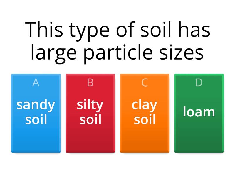 1) This type of soil has large particle sizes a) sandy soil b) silty soil c) clay soil d) loam 2) Which soil feels smooth when wet? a) humus b) top soil c) sub soil d) parent material e) bed rock 3) Which soil would be the best for plant growth? a) sandy soil b) loam soil  c) clay soil d) silty soil 4) Which horizion has the most nutrients? a) humus b) top soil c) sub soil d) parent material e) bed rock 5) This type of soil has the greatest water retention. (It holds a lot of water) a) sandy soil b) silty soil c) clay d) loam 6) What is the name of the measurement line on a graduated cylinder? a) mary line b) mile line c) monotonous line d) meniscus line 7) Which soil has the smallest particle size? a) sandy soil b) silty soil c) clay soil d) loam 8) What type of soil can you find on a farm or in a garden? a) sandy soil b) silty soil c) clay soil d) loam 9) This type of soil would not be the best for plants a) sandy soil b) silty soil c) clay soil d) loam 10) The biggest plant roots are found in this horizon. a) humus b) top soil c) sub soil d) parent material e) bed rock 11) Why would clay not be the best soil for plants? a) because it has dead plants and animals b) because it does not retain enough water and the plant will not survive. c) clay is the best soil for plants. d) because it holds too much water and can drown the plant. 12) This type of soil holds the least amount of water a) sandy soil b) silty soil c) clay soil d) loam 13) What is soil composed of? a) Pebbles, finely ground rock and organic matter b) Pebbles and rocks c) Dirt and rock 14) What is meant by the amount of water retained? a) The amount of water that is let go b) The amount of water the soil held or absorbed. c) The amount of water that goes through 15) Which level has little to no water and is made mostly of rock? a) humus b) top soil c) sub soil d) parent material e) bed rock