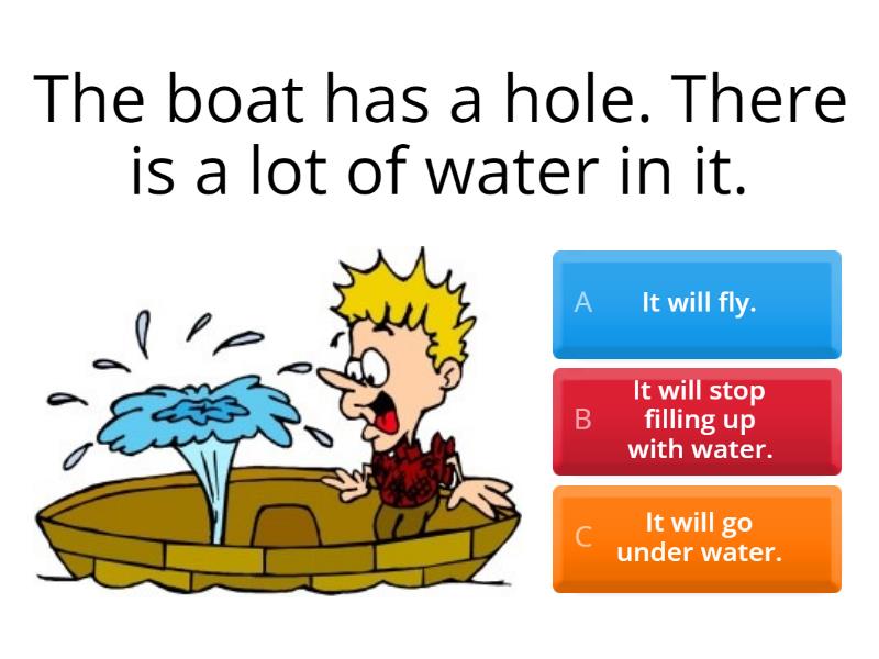 1) The boat has a hole. There is a lot of water in it. a) It will fly. b) It will stop filling up with water. c) It will go under water. 2) Suddenly the sky gets dark. a) It is going to rain. b) It is nice weather. c) It is going to be sunny. d) It is going to be hot. 3) The red team has a score of 90. The other team has a score of 55. a) The red team is going to lose. b) The red team is going to sleep. c) The red team is going to win. 4) It is raining very hard and Jen is walking in the street with no umbrella. a) She is going to be happy. b) She is going to be wet. c) She is going to swim. 5) It is windy. The tree makes a strange noise. a) The tree will walk. b) The tree is going to sing. c) The tree is going to fall down. 6) The test is hard. You are studying. a) You are going to pass the test. b) You are going to fail the test. c) You are not taking the test.