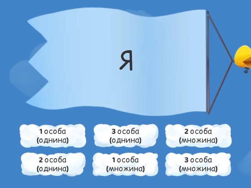 1 особа (однина) - Я, 2 особа (однина) - Ти, 1 особа (множина) - Ми, 2 особа (множина) - Ви, 3 особа (однина) - Він, вона, воно, 3 особа (множина) - Вони,