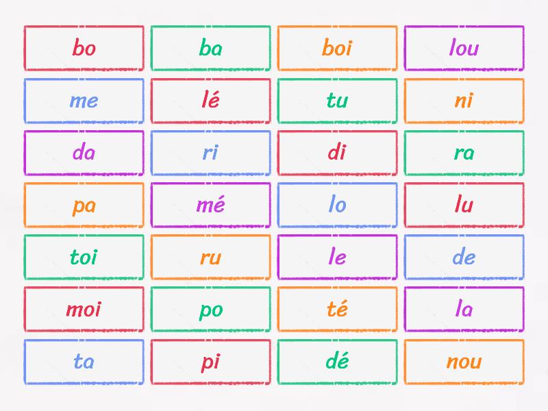 la, le, lu, lé, lo, lou, toi, ru, ri, ra, me, mé, moi, pa, pi, po, té, tu, ta, ni, nou, dé, da, de, ba, boi, bo, di,