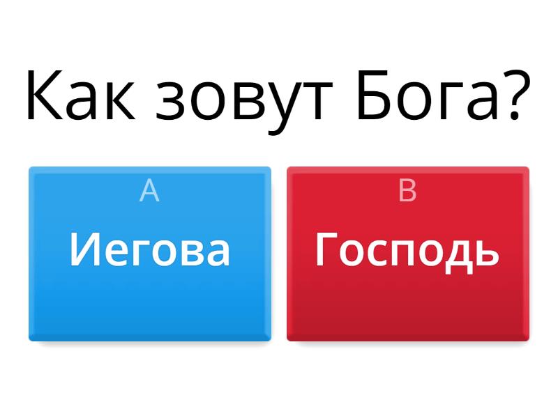 1) Как зовут Бога? a) Господь b) Иегова 2) Кто построил ковчег? a) Иван b) Иисус c) Ной 3) Какое животное разговаривало с Евой a) Змея b) Ящерица c) Белка 4) Кто победил Голиафа? a) Вазген b) Давид c) Самвел 5) Какую книгу нужно читать каждый день? a) Сказки b) Библия 6) Какие мультики смотрят дети которые любят Иегову? a) Коля и Соня b) Лунтик c) Смешарики 7) Кто создал Землю? a) Иисус b) Люди c) Иегова 8) Кого Иегова поселил в эдемском саду? a) Иван и Таня b) Саша и Маша c) Адам и Ева 9) Как звали маму Иисуса? a) Наташа b) Мария c) Таня 10) Что ожидает Иегова от детей? a) Слушать папу и маму b) Плохо себя вести c) Есть много сладостей
