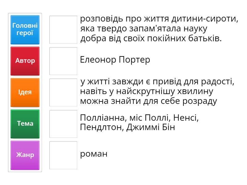 Автор - Елеонор Портер, Жанр - роман, Тема - розповідь про життя дитини-сироти, яка твердо запам’ятала науку добра від своїх покійних батьків., Ідея - у житті завжди є привід для радості, навіть у найскрутнішу хвилину можна знайти для себе розраду, Головні герої - Полліанна, міс Поллі, Ненсі, Пендлтон, Джиммі Бін,