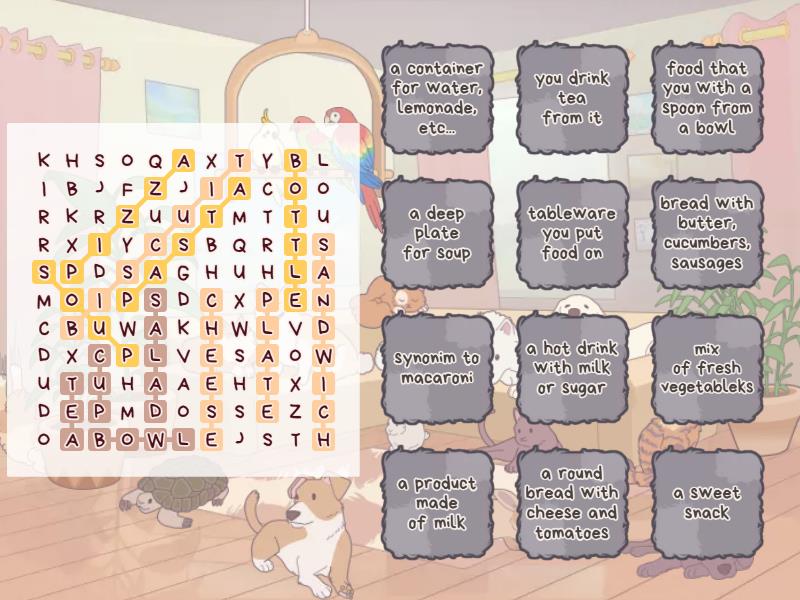 cheese - a product made of milk, soup - food that you with a spoon from a bowl, tea - a hot drink with milk or sugar, biscuit - a sweet snack, pizza - a round bread with cheese and tomatoes, salad - mix of fresh vegetableks, sandwich - bread with butter, cucumbers, sausages, pasta - synonim to macaroni, bowl - a deep plate for soup, plate - tableware you put food on, bottle - a container for water, lemonade, etc..., cup - you drink tea from it,