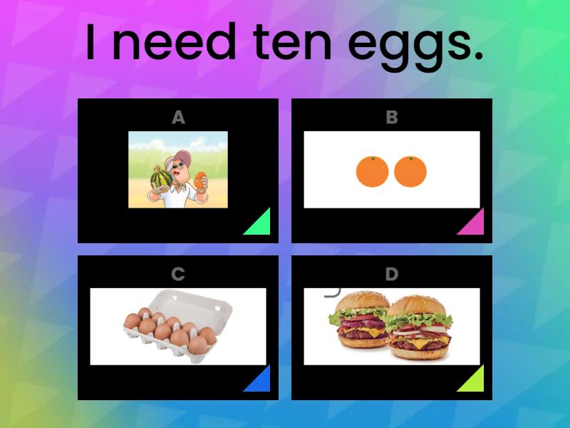 1) I need ten eggs. a) b) c) d) 2) I need two oranges. a) b) c) d) 3) Mike needs one watermelon and two oranges. a) b) c) d) 4) I need two hamburgers. a) b) c) d) 5) I need five apples. a) b) c) d) 6) She needs twelve strawberries. a) b) c) d) 7) How many cookies do you need? a) I need five cookies. b) I need three oranges. c) I need six hot dogs. d) I need fifteen cookies. 8) How many sandwiches do you need? a) I need five oranges. b) I need three watermelons. c) I need twenty hot dogs. d) I need twenty sandwiches. 9) How many cookies does he need? a) He needs one cookie. b) He needs three hot dogs. c) He needs three cookies. d) He needs one hot dog. 10) She needs twelve strawberries. a) How many strawberries do you need? b) How many strawberries does he need? c) How many strawberries does she need? d) How many cakes does she need?
