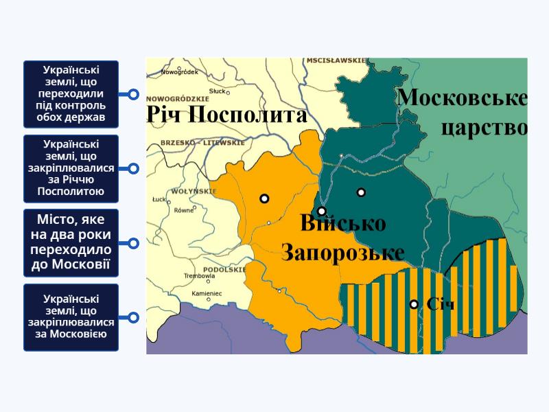 Українські землі, що закріплювалися за Річчю Посполитою, Українські землі, що закріплювалися за Московією, Українські землі, що переходили під контроль обох держав, Місто, яке на два роки переходило до Московії.