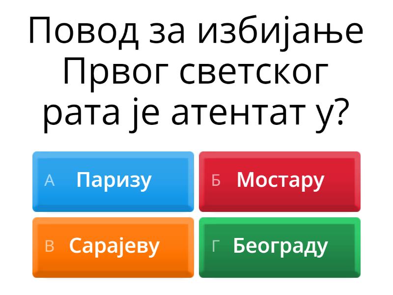 1) Повод за избијање Првог светског рата је атентат у? a) Београду b) Мостару c) Паризу d) Сарајеву 2) Атентат у Сарајеву је извршио? a) Гаврило Принцип b) Степа Степановић c) Црвени барон d) Анте Павелић 3) Атентат у Сарајеву је био на који празник? a) Божић b) Цвети c) Сретење d) Видовдан 4) У Првом светском рату су ратовале Централне силе и силе? a) Брикса b) Запада c) Истока d) Антанте 5) Избаци уљеза међу централним силама? a) Аустругарска b) Немачка c) Румунија d) Османско царство- Турска 6) Избаци уљеза међу силама антанте? a) Француска b) Велика Британија c) Србија d) Бугарска 7) Која држава је закаснила у расподели колонија? a) Велика Британија b) Француска c) Немачка d) Шпанија 8) У Првом светском рату је Италија била на страни Србије? a) ТАЧНО b) НЕТАЧНО 9) Прве велике српске победе 1914. године су биле где? a) Цер b) Колубара c) Кајмакчалан d) Мојковац e) Битољ 10) Који фронт је отворен у Грчкој 1915. године? a) Балкански b) Критски c) Солунски d) Крфски 11) Како се звао српски краљ у периоду Првог светског рата? a) Петар b) Александар c) Милан d) Милош 12) Током 1914. Французи су успели да одбране Париз у бици на реци? a) Марни b) Сени c) По d) Тибар 13) Крвава битка код града Вердена се 1916. године водила између Француза и? a) Немаца b) Аустријанаца c) Бугара 14) У бици на реци Соми је први пут употребљено које наоружање? a) Тенк b) Бомба c) Бојни отров d) Калашњиков 15) Први светски рат се завршио 11. новембра капитулацијом које државе? a) Немачке b) Бугарске c) Аустроугарске d) Швајцарске 16) Пре Немачке капитулирала је? a) Аустроугарска b) Француска c) Румунија d) Велика Британија 17) Први светски рат је завршен које године? a) 1916. b) 1915. c) 1920. d) 1918. 18) Први светски рат је завршен победом? a) антанте b) централних сила 19) Италија је ушла у рат настрани антанте зато што јој је обећана која територија? a) Далмација b) Славонија c) Срем d) Косово 20) Бугарска је у Првом светском рату била на страни? a) антанте b) централних сила 21) САД су биле на страни? a) антанте b) централних сила 22) САД су ушле у Први светски рат због? a) кредита b) напада Јапана на Перл Харбур c) атентата у Сарајеву 23) Ултиматум је? a) Крајњи рок за испуњавање захтева b) молба c) највиши правни акт 24) Мобилизација је? a) војна обавеза b) доктрина c) помиловање 25) Гаврило Принцип је био припадник које организације? a) Млада Босна b) Јеховини сведоци c) Млада Србија 26) Аустроугарска је обjавила рат Србији? a) 28. маја b) 28. јула c) 4. јула d) 2. јула 27) Командант аустругарских снага приликом напада на Србију 1914. био је? a) Оскар Поћорек b) Лајош Кошут c) Август Макензи 28) Врховни командант српске војке био је? a) регент Александар Карађорђевић b) Момчило Гаврић c) Петар Живоковић 29) Прва савезничка победа била је у августу 1914.? a) верденска битка b) церска битка c) битка на Соми 30) Током церске битке истакао се српски генерал? a) Степа Степановић b) Петар Бојовић c) Милан Недић d) Живојин Мишић 31) Новембра и децембра 1914. Срби су водили коју битку a) на Кајмакчалану b) код Битоља c) колубарску битку d) церску битку 32) Током колубарске битке истакао се српски генерал? a) Степа Степановић b) Живојин Мишић c) Петар Бојовић d) Милан Недић 33) Пошто Аустроугарска није могла сама да савлада Србију 1915. године нападају још Немачка и ? a) Бугарска b) Румунија c) Италија d) Белгија 34) Најодликованија жена војник на свету, Српкиња, борила се у Балканским и у Првом светском рату? a) Милунка Савић b) Јованка Савић c) Светлана Јовановић 35) Српска сликарка, страд