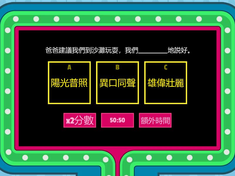 1) 爸爸建議我們到沙灘玩耍,我們___________地説好。 a) 陽光普照 b) 異口同聲 c) 雄偉壯麗 2) 新年時,在維港兩岸放的煙花_____________,吸引很多遊人觀賞。 a) 引以為傲 b) 燦爛奪目 c) 雄偉壯麗 3) 青馬大橋的身影____________,令人歎為觀止。 a) 引以為傲 b) 雄偉壯麗 c) 燦爛奪目 4) 學生的_________是交齊功課,遵守校規,你做得到嗎? a) 責任 b) 獲得 c) 安排 5) 弟弟在中文默書得到一百分,也不會驕傲,______________我們學習。 a) 安排 b) 負責 c) 值得 6) 小英在繪畫比賽中__________了第一名,感到很高興。 a) 阻止 b) 適合 c) 獲得 7) 妹妹______爛漫,活潑可愛,家人都很喜愛她。 a) 報告 b) 天真 c) 選擇 8) 為了取得好成績,我們一定要___________時間温習 。 a) 適合 b) 安排 c) 阻止 9) 在球場上的運動員必須遵守規則,否則有機會被____________停賽。 a) 罰 b) 嚷 c) 登 10) 選擇課外活動時,需要配合自己的_________才能報名。 a) 客廳 b) 年齡 c) 附近 11) 我們應該_____________弟弟做出不應該的行為,例如沒有排隊買食物。 a) 冒險 b) 阻止 c) 安排