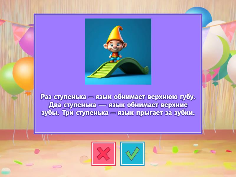 На веселые качели Таня и Никита сели. Опустились вниз качели, А потом наверх взлетели. Вместе с птицами, наверно, Улететь они хотели., Каждый раз по воскресеньям Мы едим с тобой варенье. Верхнюю губу вареньем Мы намажем, а потом Язычком широким сразу Мы варенье облизнем., Будешь пить с друзьями чай Ты из чашки новой. Эту чашку показать Ты сейчас пробуй!, Наши губки улыбнулись, Прямо к ушкам потянулись. Ты попробуй «И-и-и» скажи, Свой заборчик покажи, Раз ступенька – язык обнимает верхнюю губу. Два ступенька — язык обнимает верхние зубы. Три ступенька – язык прыгает за зубки., Друг за другом, друг за другом Ходят стрелочки по кругу. Ты обе губки оближи, Как стрелки ходят, покажи.,