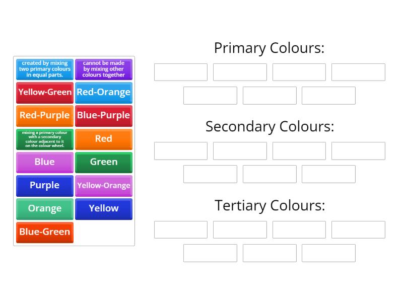 Primary Colours:: Red, Yellow, Blue, cannot be made by mixing other colours together, Secondary Colours:: Orange , Green , Purple, created by mixing two primary colours in equal parts., Tertiary Colours:: Red-Orange , Yellow-Orange, Yellow-Green , Blue-Green , Blue-Purple , Red-Purple , mixing a primary colour with a secondary colour adjacent to it on the colour wheel.,