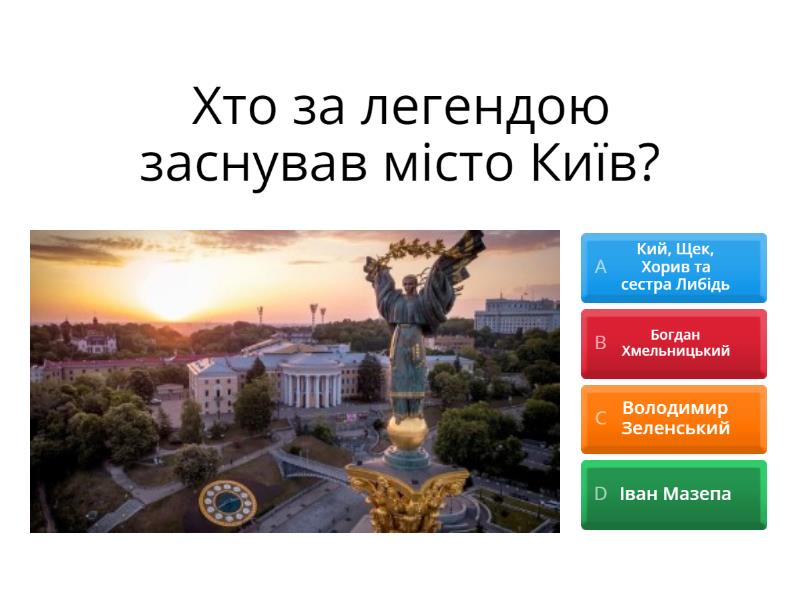 1) Хто за легендою заснував місто Київ?  a) Кий, Щек, Хорив та сестра Либідь b) Богдан Хмельницький c) Володимир Зеленський d) Іван Мазепа 2) Найзапальніша жінка-лідер України? a) Юлія Тимошенко b) Княгиня Ольга c) Альона Альона d) Тіна Кароль 3) Ви в географічному центрі Європи. Де саме ви знаходитесь? a) Рахів b) Ялта c) Львів d) Дніпро 4) У якому місті України видобувають каву? a) Харків b) Тернопіль c) Львів d) Чернігів 5) Із якого високогірного міста України відкриваються найгарніші краєвиди? a) Рівне b) Євпаторія c) Івано-Франківськ d) Чернівці 6) Найдовший інструмент в українській музиці? a) Трембіта b) Тромбон c) саксофон d) Сопілка 7) Перший космонавт України - це a) Леонід Каденюк b) Віталій Кличко c) Леонід Попов d) Григорій Сковорода 8) Найбільший український літак у світі ? a) Надія b) Мрія c) Марія d) Віра 9) Оберіть із запропонованого списку першу Гетьманську столицю України a) Батурин b) Запоріжжя c) Харків d) Чигирин 10) Хто був найвідомішим гетьманом, який очолив українське повстання? a) Богдан Хмельницький b) Іван Мазепа c) Петро Порошенко d) Пилип Орлик 11) Гарний молодий, має одяг чарівний. Біла блуза, червоні чобітки, та гарний чуб на голові. Не боїться він війни. Скаче гарно на коні, разом із шаблею в руці. a) Моряк b) Козак c) Яничар d) Лицар 12) Укажіть найбільшу річку України та назву козацького човна? a) Дністер, драккар b) Буг, каное c) Десна, трієра d) Дніпро, чайка