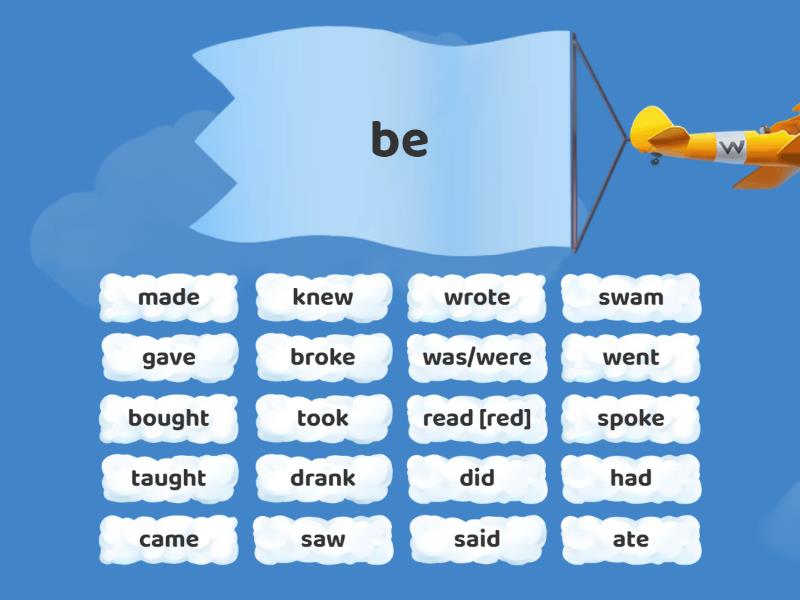 was/were - be, broke - break , bought - buy, did - do, drank - drink, came - come, ate - eat, gave - give, went - go, had - have, knew - know, made - make, read [red] - read, said - say, spoke - speak, swam - swim, taught - teach, wrote - write, saw - see, took - take,