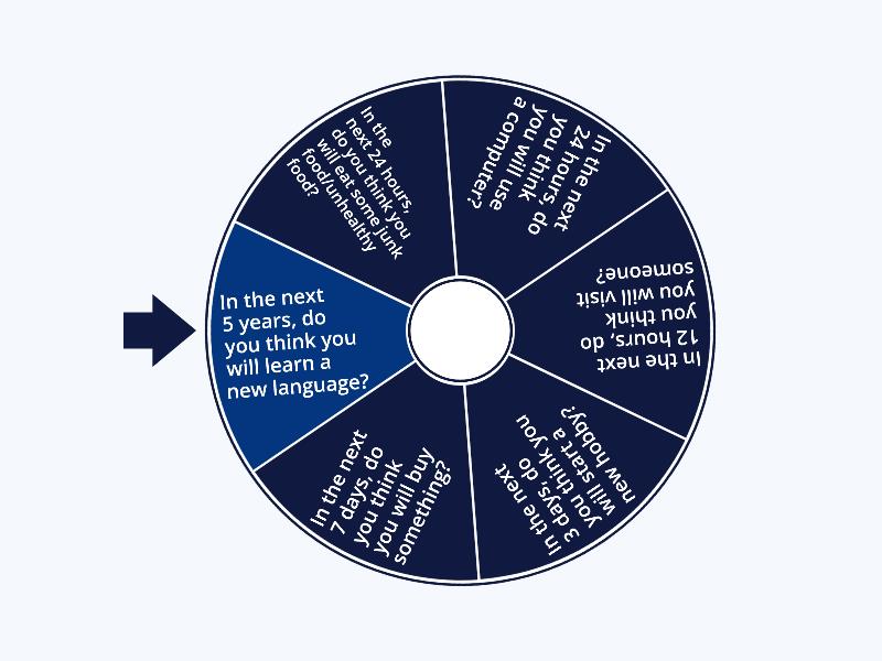 1) In the next 24 hours, do you think you will eat some junk food/unhealthy food?  2) In the next 24 hours, do you think you will use a computer?  3) In the next 12 hours, do you think you will visit someone?  4) In the next 3 days, do you think you will start a new hobby?  5) In the next 7 days, do you think you will buy something?  6) In the next 5 years, do you think you will learn a new language?
