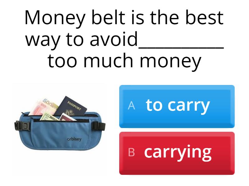 1) Money belt is the best way to avoid__________ too much money a) to carry b) carrying 2) My mother enjoys ____________ in summer a) to travel b) travelling 3) I finish _________ the house a) to clean b) cleaning 4) My little brother always imagines ___________ on other planets a) to live b) living 5) I expect __________ this letter tomorrow a) to get b) getting 6) We decided __________ to Amsterdam last week a) to go b) going 7) I wanted __________ a doctor when I was a child a) to be b) being 8) I need _________now. It's late a) to go b) going 9) I chose ___________ my big suitcase this time a) to take b) taking 10) My boss hopes ___________ lots of contracts a) to get b) getting 11) I would like ___________ a cup of coffee, please a) to have b) having 12) Look at those clouds! It seems ____________ a) to rain b) raining