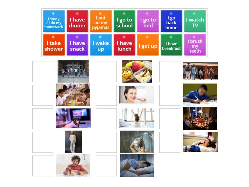 I wake up, I get up, I take shower, I have breakfast, I brush my teeth, I go to school, I go back home, I have lunch, I watch TV , I have snack, I study / I do my homework, I have dinner, I put on my pyjamas, I go to bed,