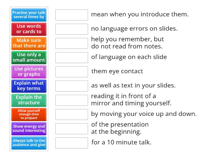 Always talk to the audience and give - them eye contact, Explain the structure - of the presentation at the beginning., Use pictures or graphs - as well as text in your slides., Show energy and sound interesting - by moving your voice up and down., Allow yourself enough time to prepare - for a 10 minute talk., Use only a small amount - of language on each slide, Make sure that there are - no language errors on slides., Practise your talk several times by - reading it in front of a mirror and timing yourself., Use words or cards to - help you remember, but do not read from notes., Explain what key terms - mean when you introduce them.,