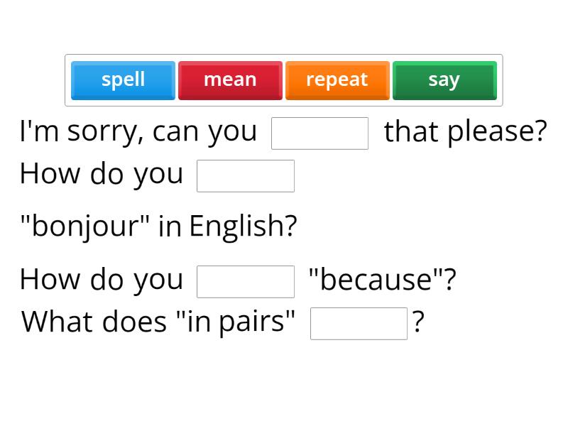 I'm sorry, can you ____ that please? How do you ____ "bonjour" in English? How do you ____ "because"? What does "in pairs" ____?