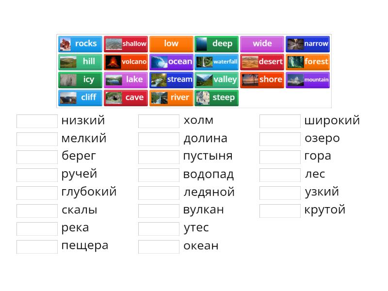 cave - пещера, cliff - утес, desert - пустыня, forest - лес, hill - холм, icy - ледяной, lake - озеро, low - низкий, mountain - гора, narrow - узкий, ocean - океан, river - река, rocks - скалы, shallow - мелкий, shore - берег, steep - крутой, stream - ручей, valley - долина, volcano - вулкан, waterfall - водопад, wide - широкий, deep - глубокий,