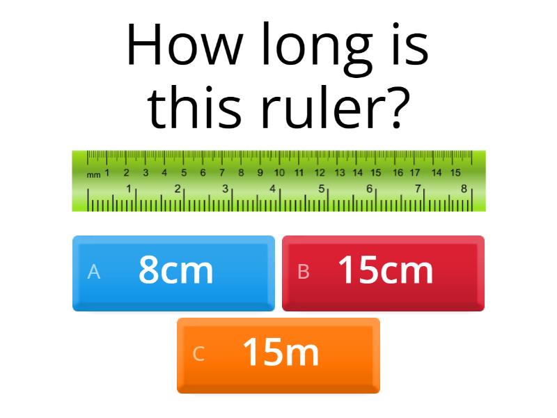 1) How long is this ruler? a) 8cm b) 15cm c) 15m 2) This is the same as....... a) 1000g b) 1000kg c) 100g 3) How many millilitres in this jug? a) 40ml b) 50ml c) 60ml 4) What are they measuring? a) temperature b) weight c) height 5) How much do the carrots weigh? a) 4kg b) 400kg c) 400g 6) What does this sign say? a) 20m maximum width b) 20m maximum height c) 20kg maximum weight 7) How many people will a 9" cake serve? a) 26 b) 30 c) 38 8) Which bowl has the smallest capacity? a) red b) blue c) green 9) Choose the correct answer a) The glass is full. b) The glass is empty. c) The glass is half full. 10) Which unit of measurement would you use to measure the length of an ant? a) millimetres b) seconds c) grams 11) Which of these is a measurement of distance? a) kilogram b) kilometre c) litre 12) Which unit would we use to measure the temperature at the beach? a) Metres b) Litres c) Degrees Celsius 13) Which unit would you use to measure the amount of milk? a) millilitres b) centimetres c) kilometres 14) Which of the following measurement of length or distance is the shortest? a) metres b) millimetres c) kilometres 15) A teaspoon is about __________________. a) 5ml b) 50ml c) 500ml 16) Which pencil is shorter? a) A b) B