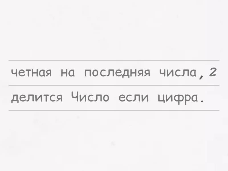 Число делится на 2, если последняя цифра числа четная., Число делится на 3, если сумма цифр делится на 3., Число делится на 4, если последние две цифры числа нули или образуют число, делящееся на 4., Число делится на 5, если последняя цифра 0 или 5., Число делится на 6, если оно делится на 2 и 3., Число делится на 9, если сумма цифр числа делится на 9., Число делится на 25, если две последние цифры числа 00, 25, 50, или 75.,
