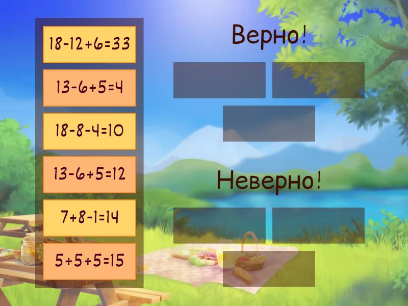 Верно!: 13-6+5=12, 7+8-1=14, 5+5+5=15, Неверно!: 13-6+5=4, 18-12+6=33, 18-8-4=10,