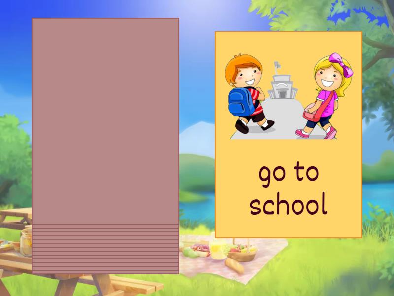 : do my homework, get up, go to bed, go to school, hang out with my friends, have a shower, have breakfast, have dinner , have lessons, have lunch, listen to music, tidy my room, watch TV, leave home, read a book,