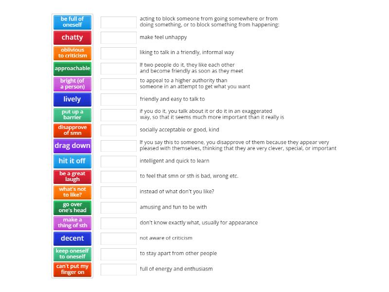 what’s not to like? - instead of what don’t you like?, lively - full of energy and enthusiasm, can’t put my finger on - don’t know exactly what, usually for appearance, drag down - make feel unhappy, put up a barrier - acting to block someone from going somewhere or from doing something, or to block something from happening:, go over one’s head - to appeal to a higher authority than someone in an attempt to get what you want, hit it off - If two people do it, they like each other and become friendly as soon as they meet, be full of oneself - If you say this to someone, you disapprove of them because they appear very pleased with themselves, thinking that they are very clever, special, or important, disapprove of smn - to feel that smn or sth is bad, wrong etc., approachable - friendly and easy to talk to, oblivious to criticism - not aware of criticism, keep oneself to oneself - to stay apart from other people, bright (of a person) - intelligent and quick to learn, chatty - liking to talk in a friendly, informal way, make a thing of sth - if you do it, you talk about it or do it in an exaggerated way, so that it seems much more important than it really is, be a great laugh - amusing and fun to be with, decent - socially acceptable or good, kind,
