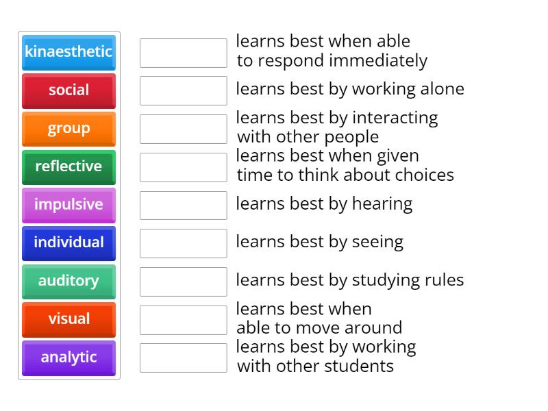 visual - learns best by seeing, auditory - learns best by hearing, kinaesthetic - learns best when able to move around, individual - learns best by working alone, reflective - learns best when given time to think about choices, group - learns best by working with other students, impulsive - learns best when able to respond immediately, analytic - learns best by studying rules, social - learns best by interacting with other people,