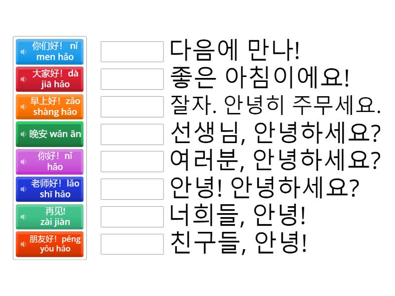 你好!nǐ hǎo - 안녕! 안녕하세요?, 你们好! nǐ men hǎo - 너희들, 안녕!, 老师好!lǎo shī hǎo - 선생님, 안녕하세요?, 大家好!dà jiā hǎo - 여러분, 안녕하세요?, 朋友好!péng yǒu hǎo - 친구들, 안녕!, 再见! zài jiàn - 다음에 만나!, 早上好!zǎo shàng hǎo - 좋은 아침이에요!, 晚安 wǎn ān - 잘자. 안녕히 주무세요.,