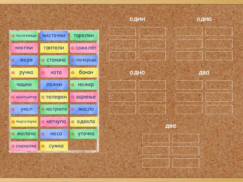 один: банан, компьютер, телефон, самолёт, номер, укол, одна: уточка, скакалка, сумка, сковорода, кастрюля, ручка, одно: полотенце, масло, варенье, одеяло, море, молоко, два: стакана, кетчупа, подсолнуха, кота, носа, две: ложки, чашки, тарелки, гантели, кисточки, кнопки,