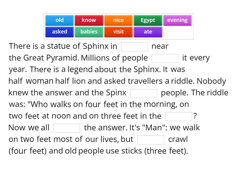 There is a statue of Sphinx in ____ near the Great Pyramid. Millions of people ____ it every year. There is a legend about the Sphinx. It was half woman half lion and asked travellers a riddle. Nobody knew the answer and the Spinx ____ people. The riddle was: "Who walks on four feet in the morning, on two feet at noon and on three feet in the ____? Now we all ____ the answer. It's "Man": we walk on two feet most of our lives, but ____ crawl (four feet) and old people use sticks (three feet).