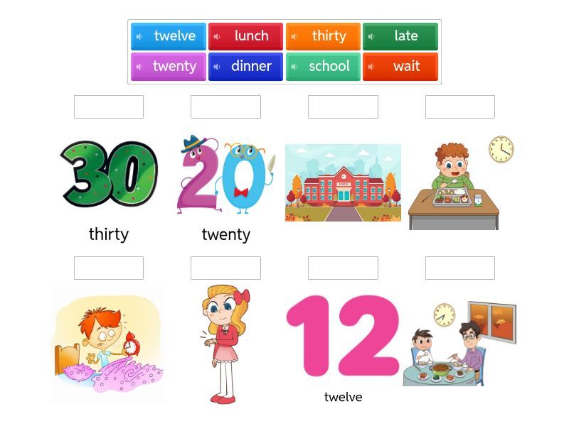 time, breakfast, lunch, dinner, eleven - eleven, twelve - twelve, twenty - twenty, thirty - thirty, forty - forty, fifty - fifty, school, bed, hurry, late, wait,