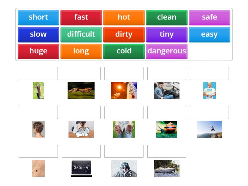 safe, clean, dirty, cold, long, fast, short, dangerous, difficult, hot, slow, tiny, huge, easy,
