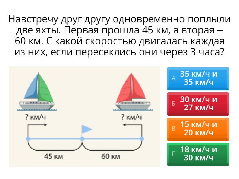 1) Навстречу друг другу одновременно поплыли две яхты. Первая прошла 45 км, а вторая – 60 км. С какой скоростью двигалась каждая из них, если пересеклись они через 3 часа? a) 35 км/ч и 35 км/ч b) 30 км/ч и 27 км/ч  c) 15 км/ч и 20 км/ч d) 18 км/ч и 30 км/ч  2) Выбери правильное утверждение. a) Скорость - это расстояние, пройденное предметом за единицу времени b) Скорость - это движение от дома до школы  c) Скорость - это расстояние, пройденное предметом d) Скорость - это затраченное на дорогу время  e) Что такое скорость?  3) В чём измеряют скорость?  a) м/с, мин, ч b) ч, км, мин c) м/мин, сек, м d) км/ч, см/с, км/мин 4) Отметь верные утверждения a) Чем выше скорость передвижения, тем большее расстояние можно пройти  b) Чем выше скорость передвижения, тем меньшее расстояние можно пройти c) Чем выше скорость передвижения, тем больше времени требуется для преодоления расстояния   d) Чем выше скорость передвижения, тем меньше времени требуется для преодоления расстояния  5) Укажи выражение, с помощью которого можно вычислить расстояние, если известно время движения t мин и скорость 95 м/мин. a) 95 : t b) 95 + t c) 95 * t d) t : 95