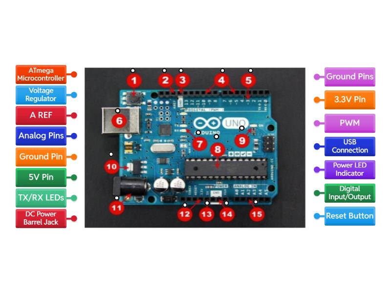 Reset Button, A REF, Ground Pin, Digital Input/Output, PWM, USB Connection, TX/RX LEDs, ATmega Microcontroller, Power LED Indicator, Voltage Regulator, DC Power Barrel Jack, 3.3V Pin, 5V Pin, Ground Pins, Analog Pins.