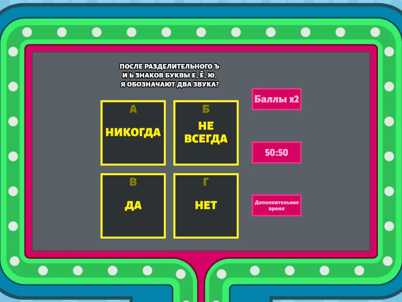 1) БУКВЫ Я, Е, Ю, Ё ОБОЗНАЧАЮТ ДВА ЗВУКА, ЕСЛИ СТОЯТ В НАЧАЛЕ СЛОВА? a) ДА b) НЕТ c) НЕ ВСЕГДА d) ИНОГДА 2) В КАКОМ ИЗ СЛОВ Ю ОБОЗНАЧАЕТ ДВА ЗВУКА? a) ЮБКА b) КЛЮКВА c) ШЛЮПКА 3) БУКВЫ Ё, Е, Ю, Я ПОСЛЕ ГЛАСНЫХ ОБОЗНАЧАЮТ ДВА ЗВУКА? a) ДА b) НЕТ c) НЕ ВСЕГДА 4) ГДЕ БУКВА Ё ОБОЗНАЧАЕТ ДВА ЗВУКА? a) ПОЁТ b) КЛЁВ c) МЁЛ d) ШЁЛ 5) ПОСЛЕ РАЗДЕЛИТЕЛЬНОГО Ъ И Ь ЗНАКОВ БУКВЫ Е, Ё, Ю, Я ОБОЗНАЧАЮТ ДВА ЗВУКА? a) ДА b) НЕТ c) НЕ ВСЕГДА d) НИКОГДА 6) Я ОБОЗНАЧАЕТ ДВА ЗВУКА ВО ВСЕХ СЛОВАХ: a) ОБЪЯВЛЕНИЕ, ЯВКА, ЯМА b) МЯЛ, РЬЯНО, ВЯЛЫЙ c) ЯБЛОКО, ШЛЯПА, ВЯЗКА 7) ПРОДОЛЖИ:ЯМА, ЯХТА, ЯЛТА.... a) ЯБЛОКО b) ЁЛКА c) ЕДА d) ЕМЕЛЯ e) ЮЛА 8) ПРОДОЛЖИ:СЪЕЛ, СЪЕЗД,СЪЕХАЛ..... a) ВЪЕХАЛ b) СМЁЛ c) СМЕЛЫЙ d) ПЛАТЬЕ 9) ВЫБЕРИ СЛОВА С РАЗДЕЛИТЕЛЬНЫМ Ь: a) ПЛАТЬЕ, ВЬЮГА, ВРАНЬЁ b) ВЪЕХАЛ, МЕТЁТ, МЕЛЬ c) ЯБЛОНЯ, БРАТЬЯ, ВЕТКА 10) ГДЕ Я - ПОКАЗАТЕЛЬ МЯГКОСТИ СОГЛАСНОГО ЗВУКА: a) МЯЛ, ВЯЛЫЙ, ТЯЖЕСТЬ b) ЯМА, ЯХТА, ЗЯБКО c) ТЯНЕТ, ЯЛИК, РЬЯНО d) ВЯНЕТ, ЯБЛОКО, ЯРКИЙ