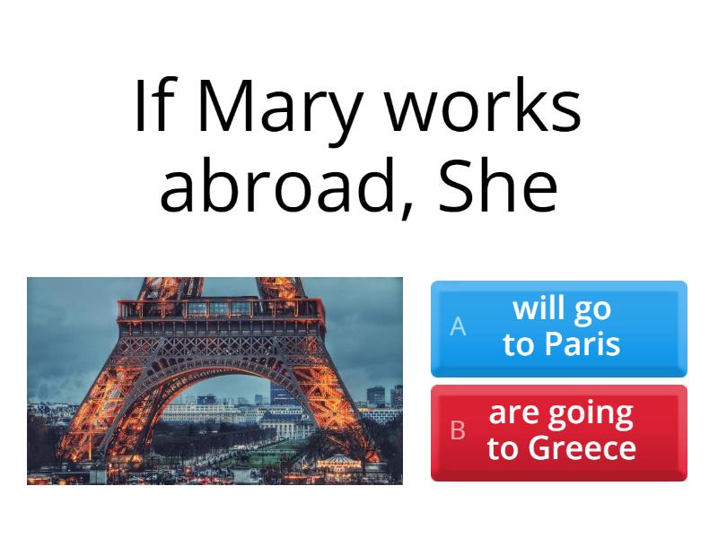 1) If Mary works abroad, She  a) will go to Paris b) are going to Greece 2) If I won the lottery, I ... travel around the world. a) would b) won´t  3) If it rains tomorrow, we ... stay home. a) would b) will 4) If I were you, I ... study more. a) would b) will 5) If they had a car, they .... drive to the beach. a) will b) would 6) If she ..... me, I ... answer the phone. a) called/ will b) calls/ will 7) If they invite us, we .... go to the party. a) will b) wouldn't 8) I .... buy a car, If I .... work. a) Will / don't b) Won´t / doesn´t c) wouldn´t / didn´t 9) Jenny .... be a nurse, If she ... the admission exam a) will / passes b) won´t / passed c) wouldn't/ passes 10) If I .... injured, I would play soccer. a) doesn't b) didn't c) wasn't